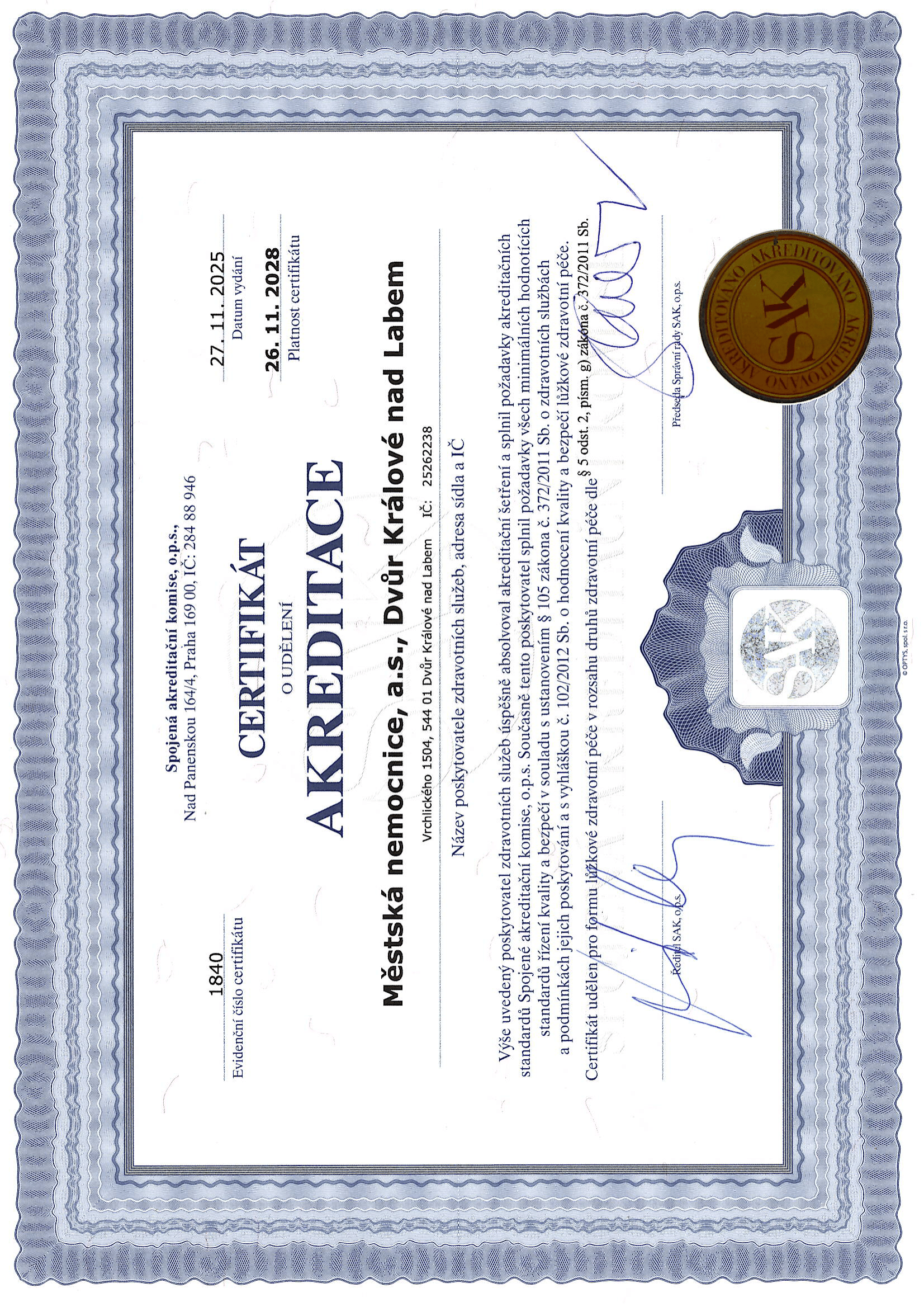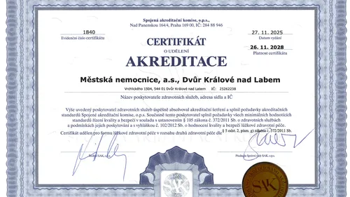 Královédvorská Městská nemocnice, která je součástí Zdravotnického holdingu Královéhradeckého kraje, úspěšně zakončila na konci listopadu 2025 náročnou přípravu na již 3.reakreditaci a po závěrečném auditu Spojené akreditační komise, o.p.s. (dále jen „SAK“) obdržela certifikát potvrzující kvalitu poskytované zdravotní péče a bezpečí pacientů.
